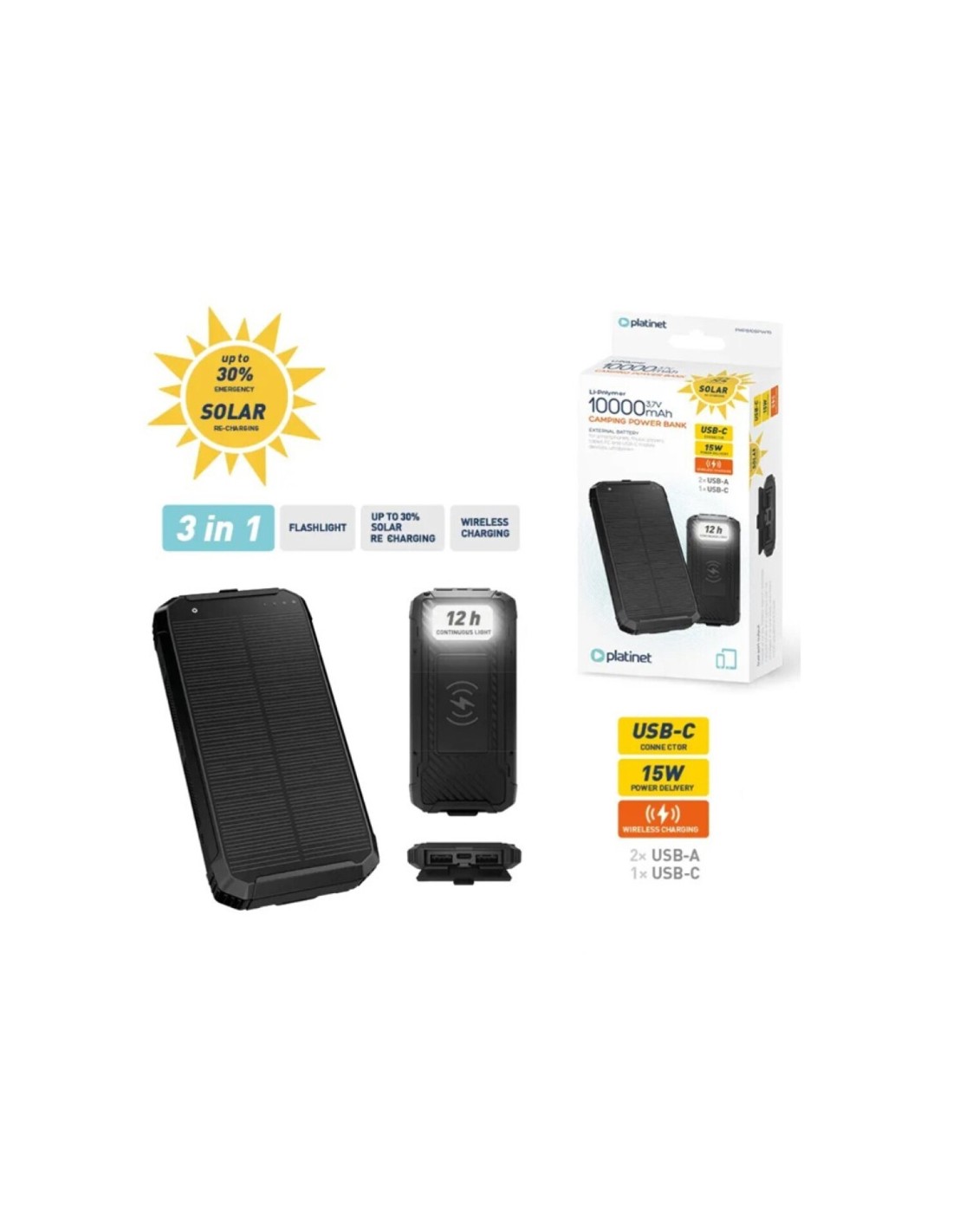 PLATINET POWERBANK CAMPING 10000mAh POLYMERO CARGADOR SOLAR + CARGADOR INALÁMBRICO 15W + LINTERNA