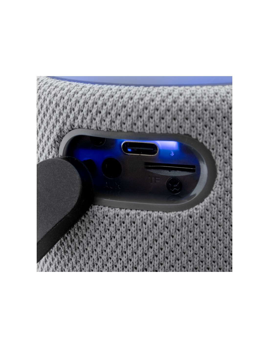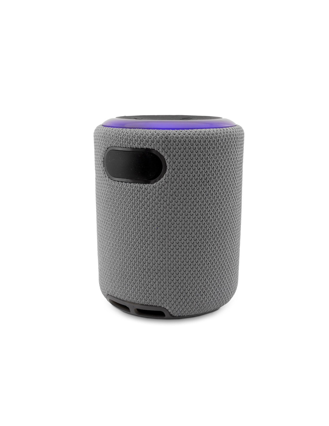 Con formato compacto (82 x 82 x 105 mm), ligero (330 g) y diseño elegante en color gris con aro superior luminoso. Permite escuchar música durante 6 horas de reproducción continua, cargando en solamente 2,5 h gracias a su conexión USB-C (cable incluido). Sonido claro y potente de 5W RMS, permite reproducción a través de conexión Bluetooth 5.3, cable auxiliar o tarjeta microSD.