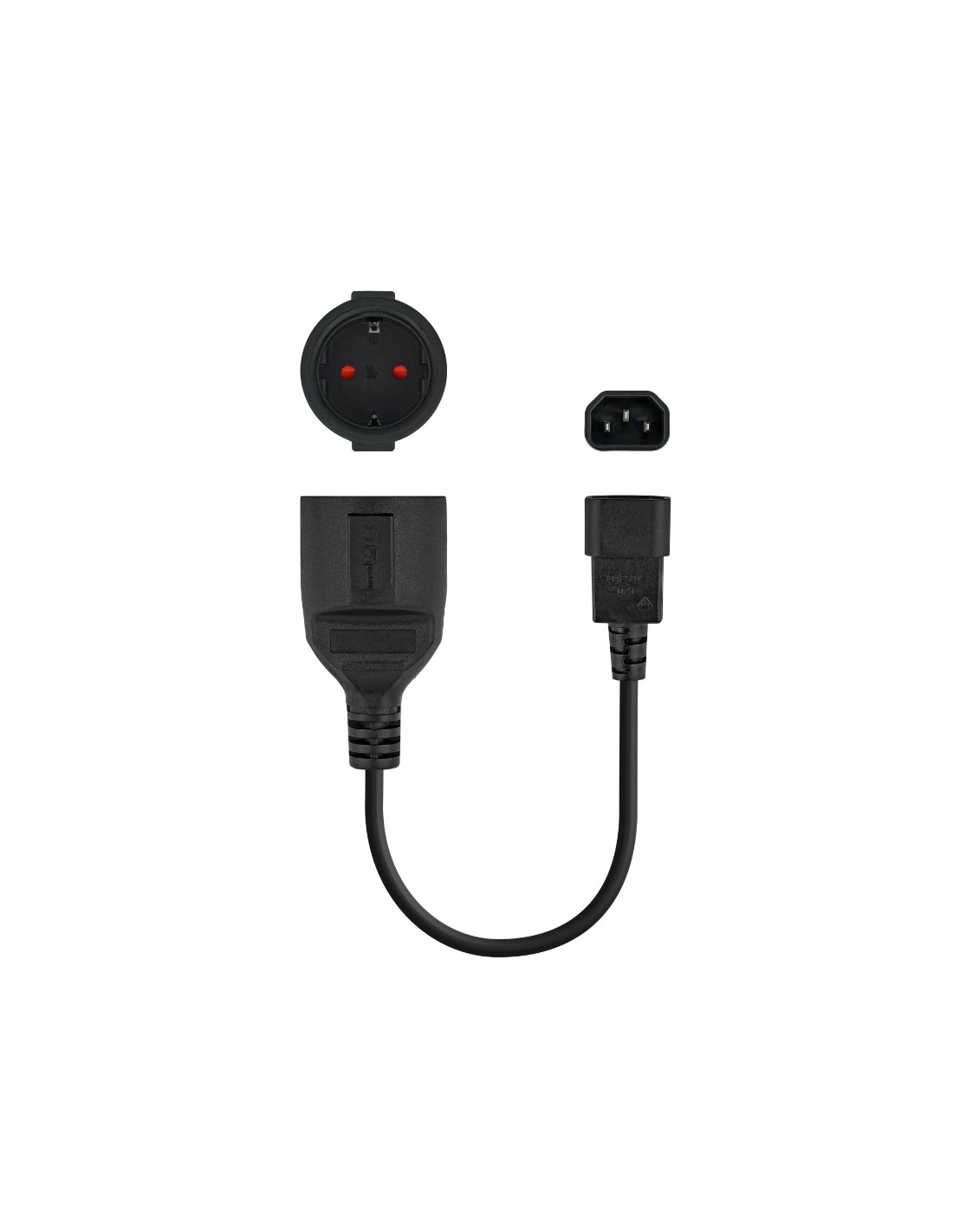 Conector C14 macho en un extremo y CEE7 (Schuko) hembra en el otro.