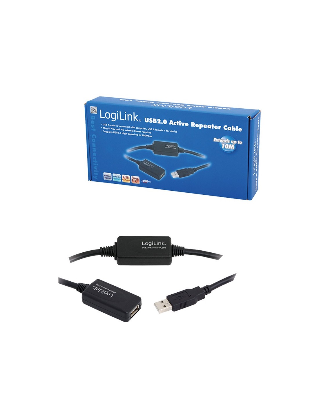 LogiLink 10m USB - USB 2.0 M/F, con amplificador de señal, Conector 2