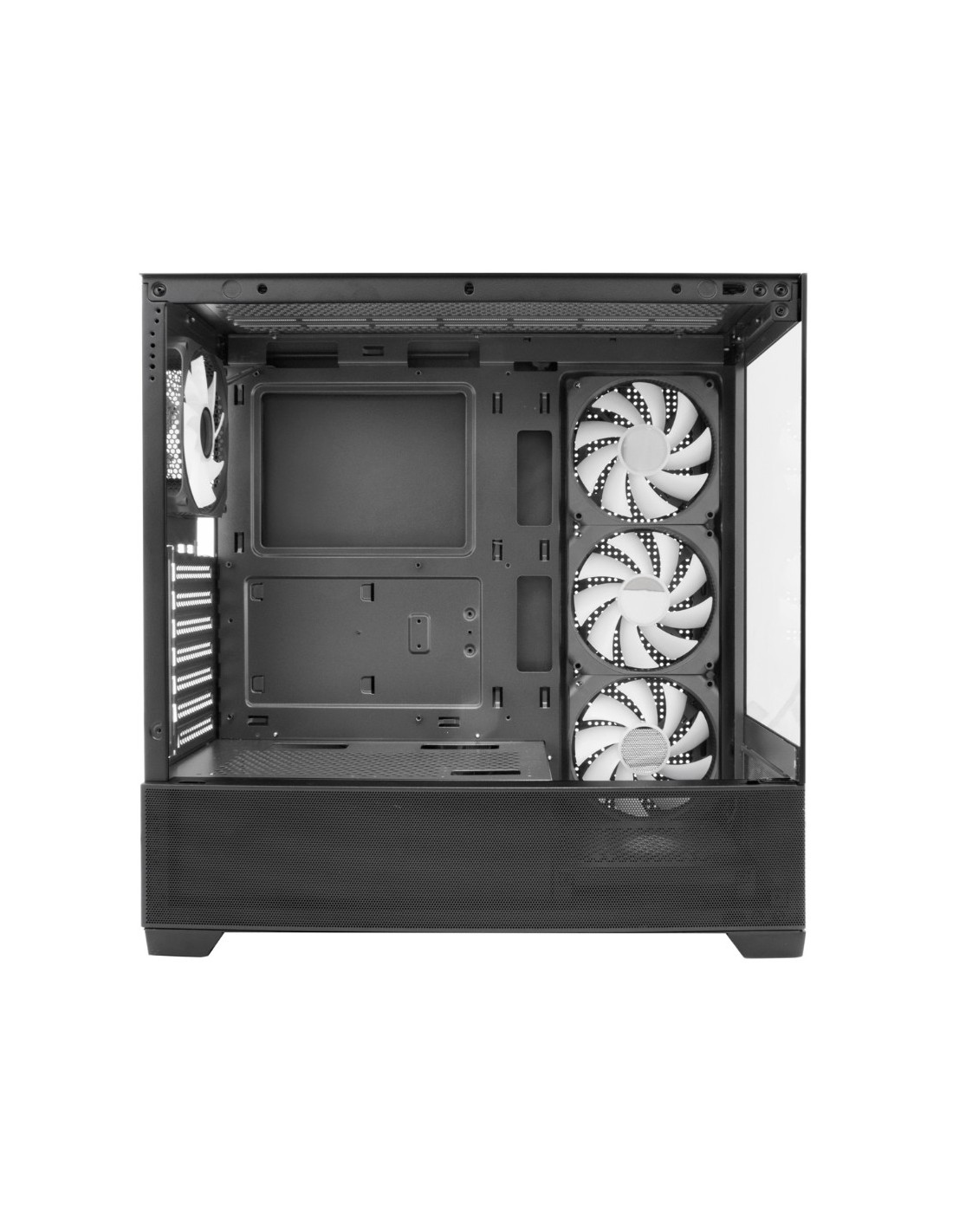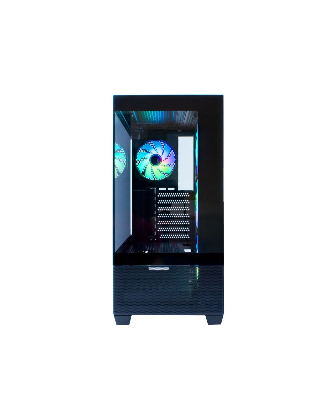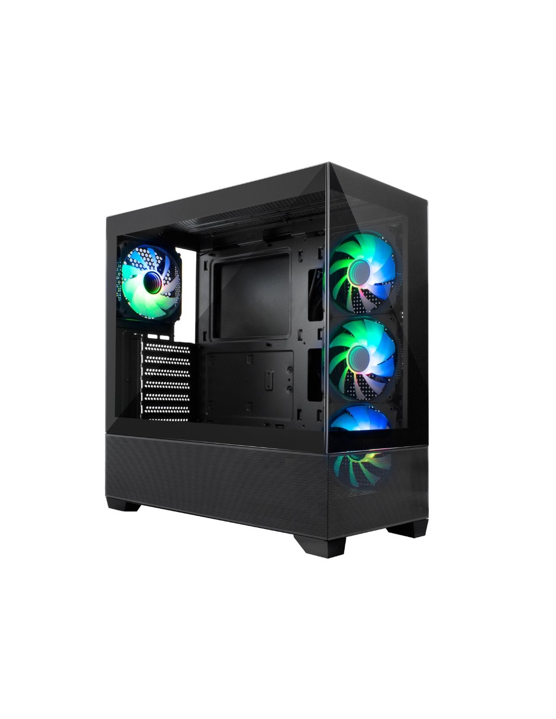 Caja para PC Gaming con cristal templado panorámico frontal y lateral. Incluye 4 ventiladores ARGB Infinity de 12 cm (1 trasero + 3 en el lateral) y es compatible con kits de refrigeración líquida de 120 mm (en la parte posterior) o 240mm/360mm (en la parte superior). Además, admite gráficas de hasta 400 mm de longitud, lo que permite crear un equipo gaming a tope de prestaciones.