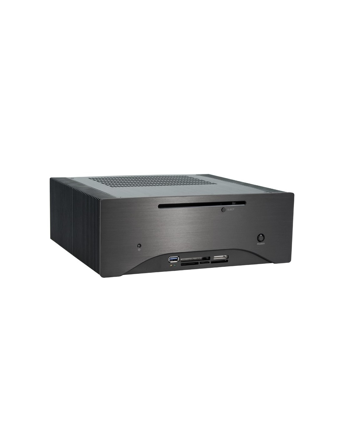 Los ventiladores ruidosos se vuelven innecesarios, ya que esta caja viene con la última tecnología de tubos de calor que permite que los componentes con calefacción térmica emitan calor a las masivas aletas de enfriamiento descendentes en ambos lados del chasis. Debido a la alta capacidad de ajuste de la tubería de calor, puede instalar todas las placas madre INTXmini ITX comunes independientemente de la posición de la CPU. Además, un lector de tarjetas está preinstalado en el panel frontal y, por supuesto, se brinda la posibilidad de instalar un ODD de línea delgada. Se debe mencionar que la PSU (85W, 90W o 120W, pendiente de la demanda individual) se resuelve externamente para que no haya ninguna fuente de emisión de sonido.