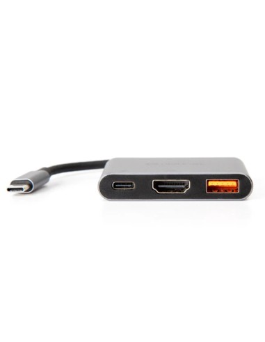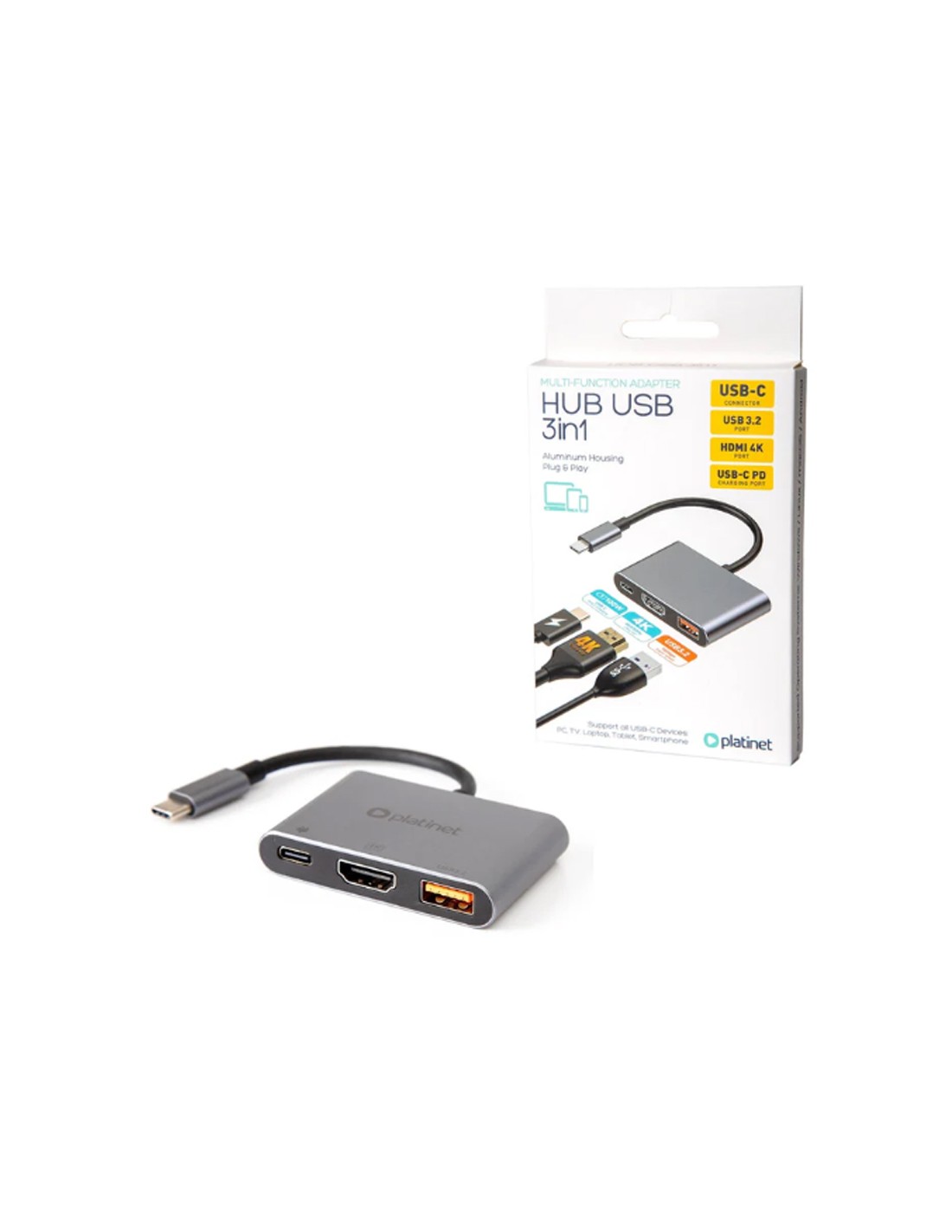 El hub Platinet 3 en 1 USB-C 3.2 incluye puertos USB 3.2, USB-C y HDMI, alimentado a través de USB-C. Perfecto para conectar dispositivos como unidades flash, discos duros externos o demás.