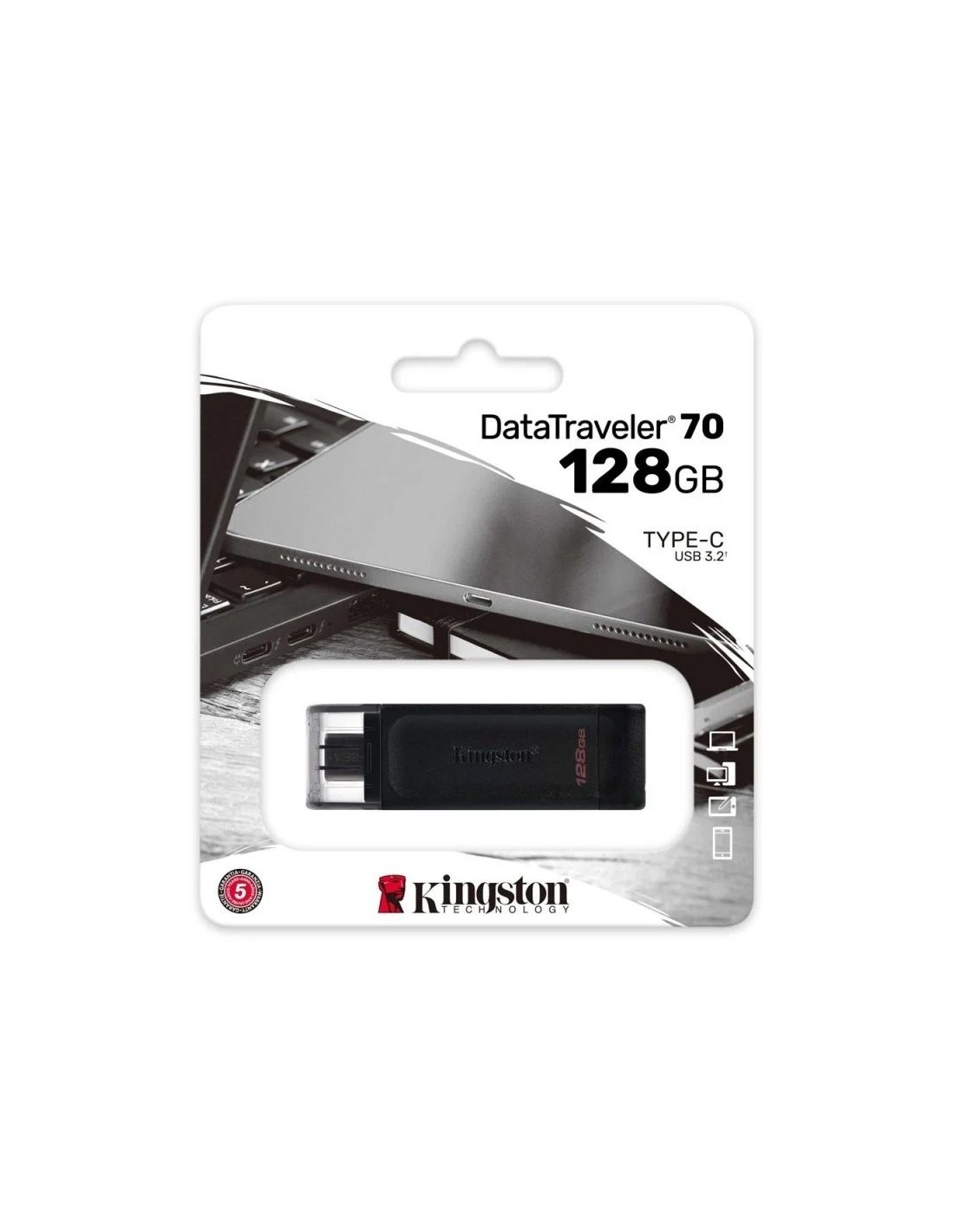 DataTraveler 70 de Kingston es una pequeña y ligera unidad Flash USB-C que alcanza velocidades de USB 3.2 Gen 1. Ha sido diseñada para dispositivos compatibles con USB-C, como notebooks, portátiles, tabletas y teléfonos inteligentes. Con capacidades de hasta 128 GB, DataTraveler70 le permitirá ampliar el almacenamiento para el uso cotidiano. Además, está respaldada por una garantía de 5 años y asistencia técnica gratuita.