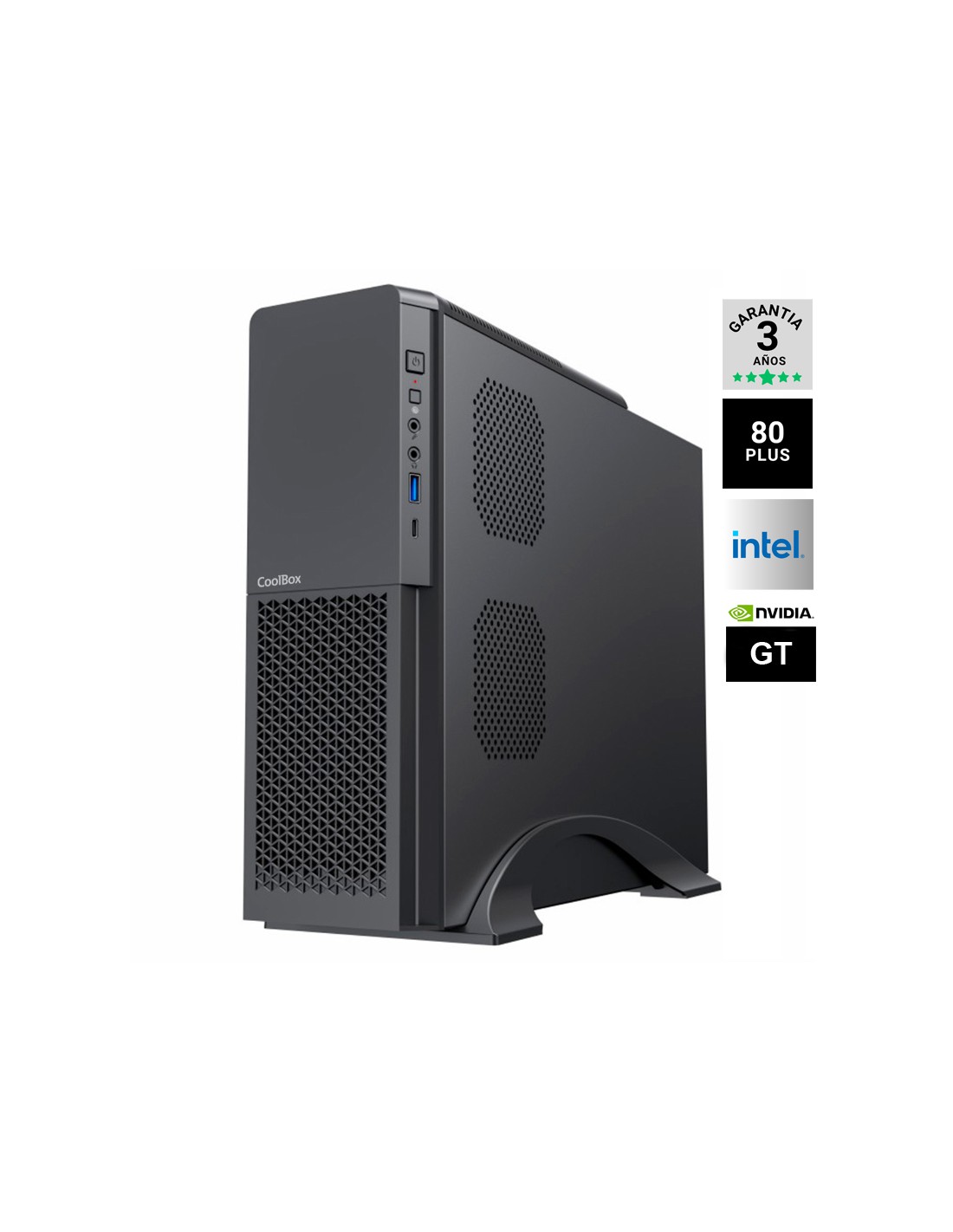 Procesador: Intel Core S-1700 I5-12400F 2.5GHz, Memoria: DDR4 8GB 3200MHZ, Disco duro: SSD M.2 256GB NVME, Vga: NVIDIA GT710 2GB GDDR5, Fuente 300W 80%, Freedos, Caja SFF MATX COOLBOX T313 SLIM Negra. PRODUCTO SUJETO A CANON DE 5,33€ QUE SE APLICARA EN FACTURA.