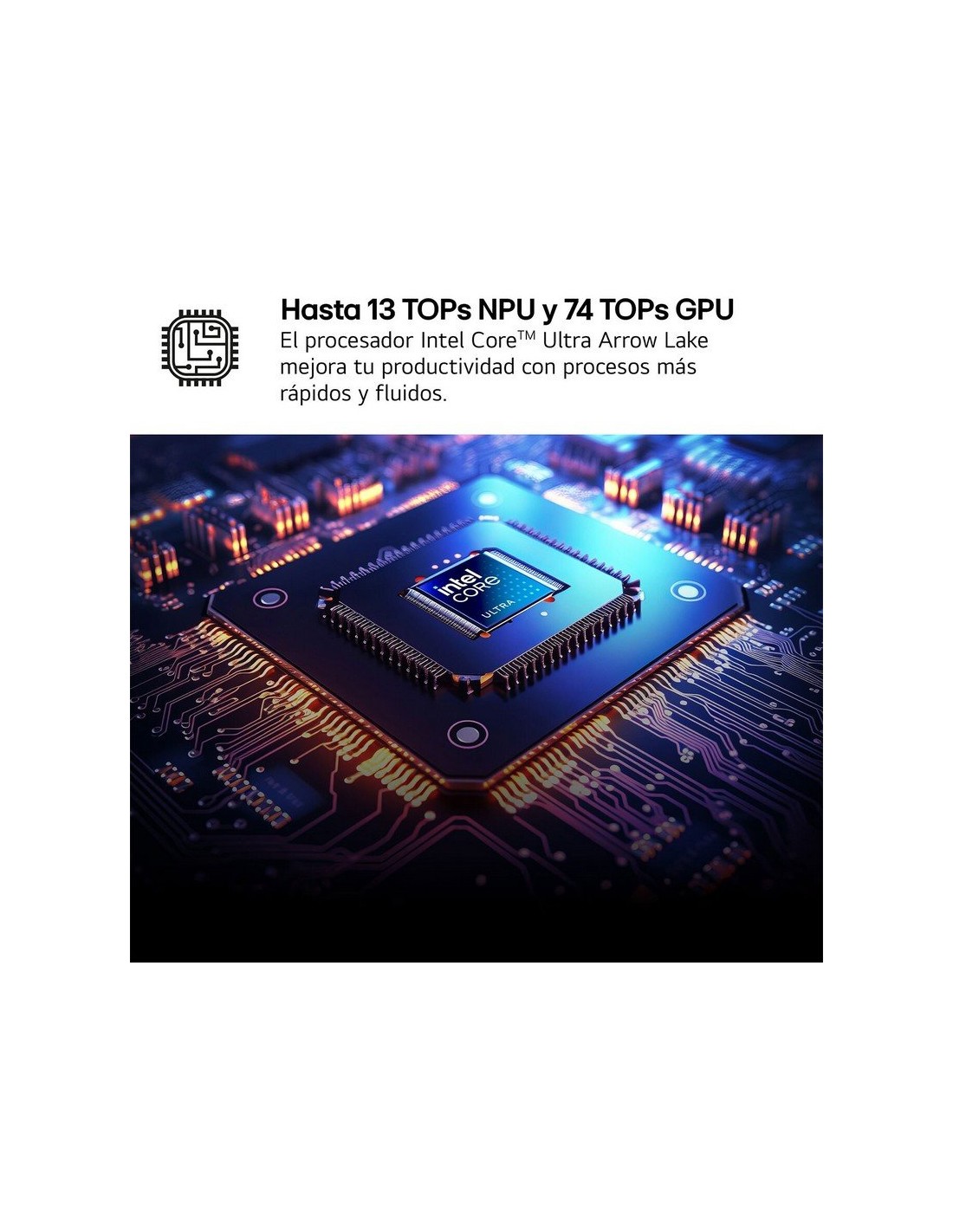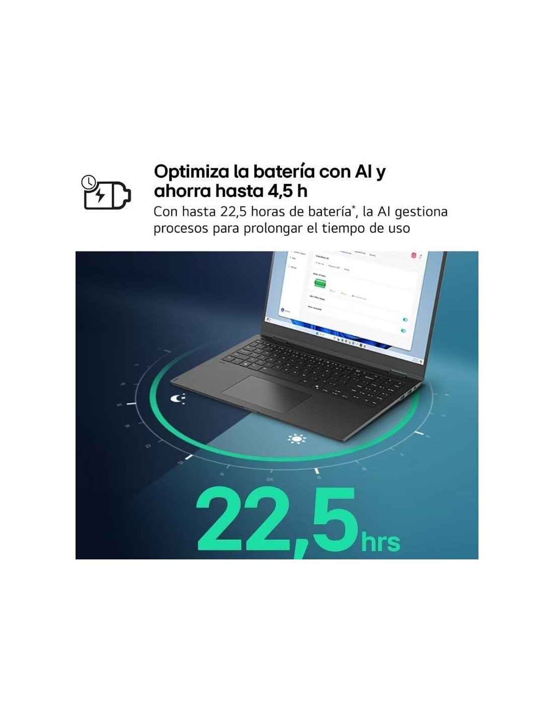 El LG Gram 16ZD90T-G AX88B redefine la portabilidad profesional: su chasis de nano carbono y magnesio, con solo 1,2 kg de peso y 15,7 mm de grosor, lo convierte en el portátil ultraligero ideal para expertos en movilidad, creadores de contenido y usuarios avanzados. Equipado con el procesador Intel Core Ultra 7-255H de 16 núcleos y gráficos Intel Arc, ofrece un rendimiento sobresaliente en tareas de edición, modelado 3D, programación y multitarea intensiva. La pantalla IPS WQXGA de 16 pulgadas (2560 x 1600) con formato 16:10 y cobertura DCI-P3 del 99 % proporciona una experiencia visual profesional, ideal para fotografía, diseño gráfico y edición de vídeo. El tratamiento antirreflejos y los 350 nits de brillo garantizan una visualización nítida incluso en entornos luminosos. La autonomía es otro de sus puntos fuertes: hasta 22,5 horas de uso gracias a su batería de 77 Wh, permitiendo jornadas completas sin depender de enchufes. La conectividad de última generación incluye Wi-Fi 7, Bluetooth 5.3, puertos Thunderbolt 4, HDMI 2.1 y USB 3.2, cubriendo todas las necesidades de transferencia y expansión profesional.