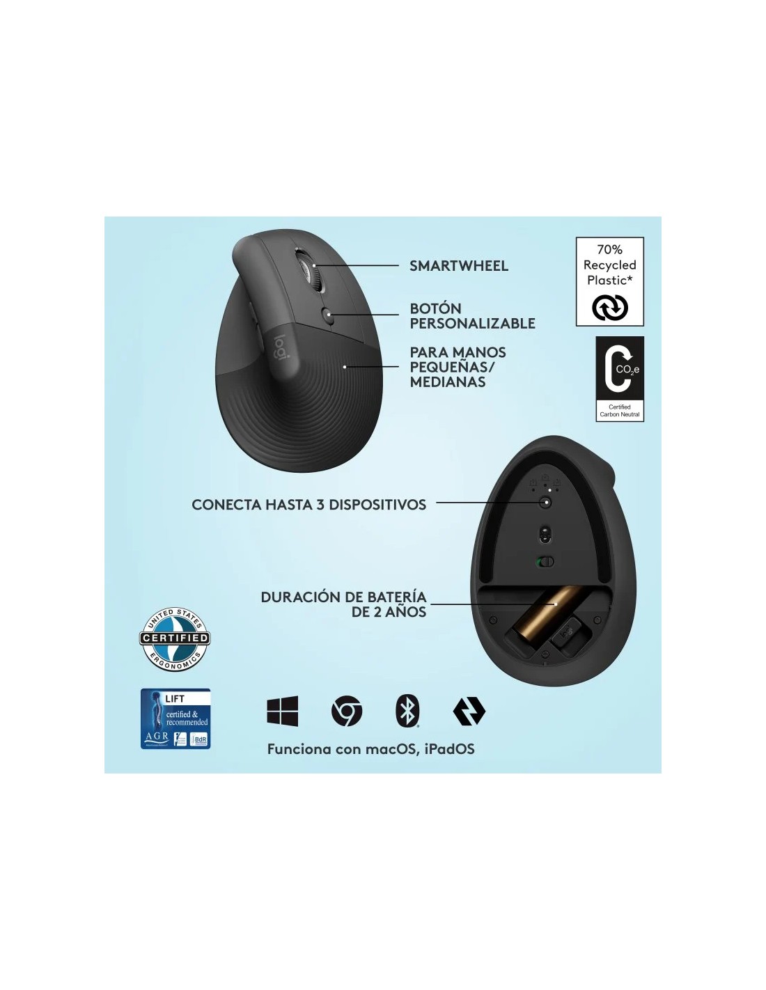 Vente arriba con Lift: Anima tu escritorio con el Ratón Ergonómico Vertical Lift de Logitech. Adecuado para manos pequeñas y medianas.