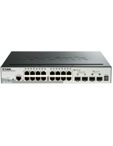 SWITCH D-Link DGS-1510-20 - (20PTOS) 16 puertos Gigabit L2+ (funcionalidades L3), 2 puertos SFP 1000 Mbps y 2 puertos 10G SFP+, apilable, altura 1U, VLAN automática para video vigilancia y telefonía IP.