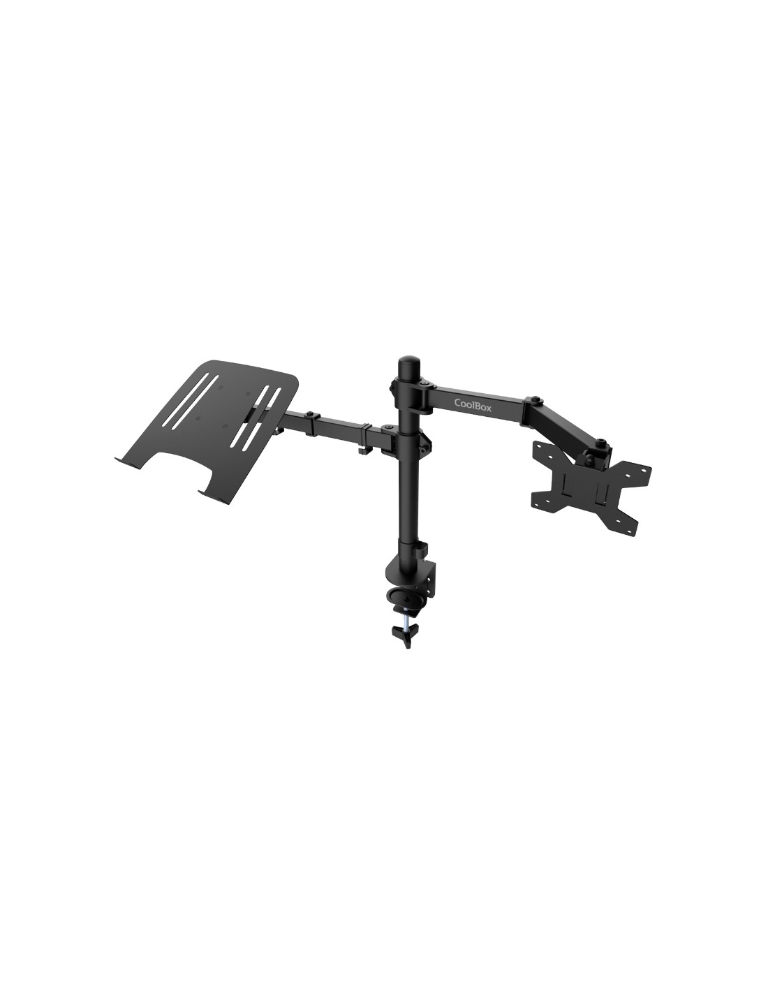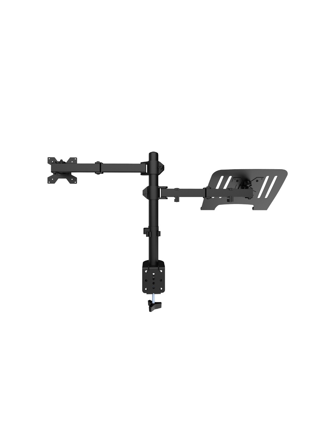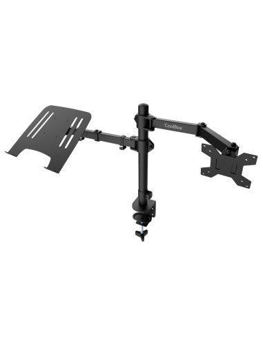El soporte tiene un diseño elegante, con acabado en color negro mate, ambos brazos cuentan con gestión de cables integrada y ha sido elaborado con acero de alta calidad. El brazo para monitores ha sido diseñado para pantallas planas de un tamaño de hasta 32 pulgadas, y con un peso máximo de 8 kg. El brazo con bandeja está pensado para soportar un ordenador portátil de hasta 17″. También existe la posibilidad  de quitar el accesorio de la bandeja para colocar un segundo monitor en este brazo. La compatibilidad con VESA 75 x 75 y 100 x 100 y su sistema de instalación mediante abrazadera, hacen de este soporte articulado el complemento ideal para despejar la mesa de trabajo y ganar espacio de manera cómoda y fácil sin tener que renunciar a la versatilidad que proporciona un ordenador portátil.